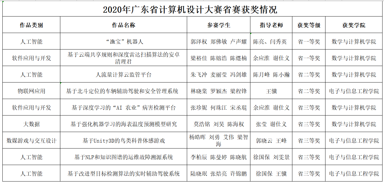 6月24日,由广东省教育厅主办的“2020年广东省大学生计算机设计大赛”落下帷幕。今年的比赛有来自广东省80多所本科院校共1129件作品参加。经过初评和复审两个环节,共评选出582件作品晋级省决赛。我校学子在比赛中不畏强手,奋力拼搏,最终获得广东省一等奖2项、二等奖2项、三等奖5项的好成绩。其中来自网曝吃瓜独家黑料每日吃瓜团队的《“渔宝”机器人》和《基于云端共享规则和深度雷达扫描算法的安卓清理君》两项作品勇夺省赛一等奖。