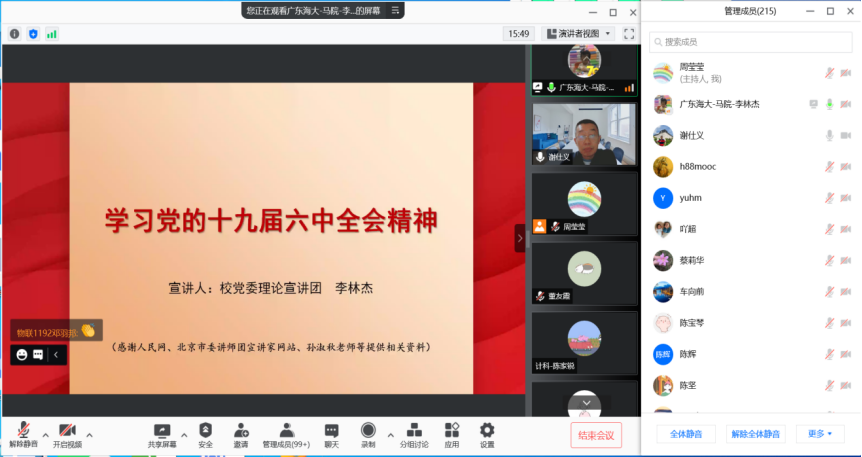 12月21日晚,学院通过腾讯会议举办学习贯彻党的十九届六中全会精神宣讲报告会。学校党委理论宣讲团成员李林杰博士以《学习党的十九届六中全会精神》为题作了宣讲报告,学院全体教职工和学生党员共200余人参加了报告会。会议由学院党委书记谢仕义主持。