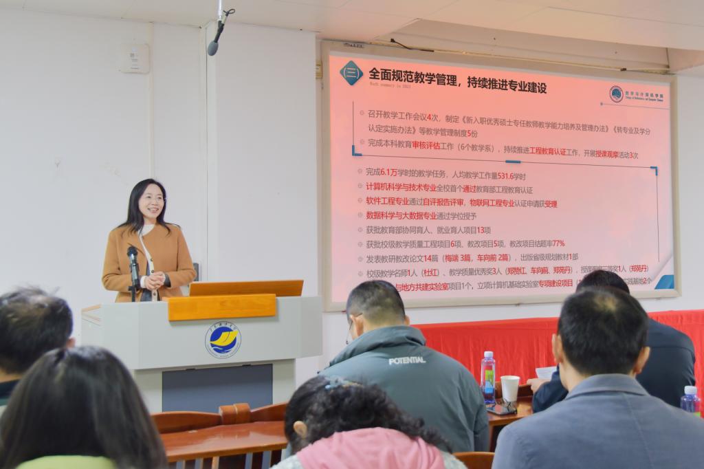 院长彭小红教授首先对2023年学院工作进行了总结,充分肯定了学院在完善规章制度、优化师资队伍、规范教学管理、加强学科建设、坚持以德树人推动学生工作以及在学科竞赛、工会活动等各方面所取得的优异成绩。然后彭小红对新学期学院的党建和思政、学风和师德建设、教学和专业建设、学科和研究生教育、科研和社会服务、推进“三全育人”体系建设等各方面工作进行了部署。