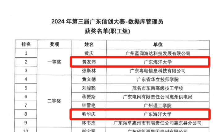 11月29日,第三届广东信创大赛——数据安全管理员职业技能竞赛、数据库管理员技能竞赛在广州举行,来自广东省各地的137家单位千余名选手参与角逐,涉及政府机关、企事业单位、高职院校及科研机构等。网曝吃瓜独家黑料每日吃瓜物联网工程系教师黄友沛、毛华庆发挥出色,最终获得数据库管理员技能竞赛(职工组)一等奖、二等奖的好成绩。