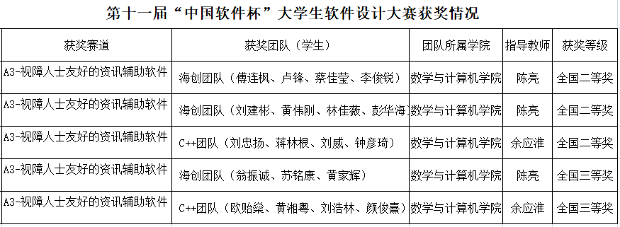“中国软件杯”软件设计大赛是全国软件行业规格最高、最具影响力的顶级软件设计大赛,被喻为全国软件产业创新的“风向标”。此次大赛历时一年,吸引了来自全国31个省份500多所高校的5576支队伍积极参与,包括南京大学、武汉大学、中山大学、北京航天航空大学、西北工业大学、北京理工大学等双一流名校,经过来自清华大学、北京大学等高校的评审教师和来自东软教育科技集团、南京苏宁软件技术有限公司等7家出题企业的数十位评审专家严格评审,最终评选出119支参赛队伍晋级全国总决赛。我校数计学子在比赛中取得好成绩充分说明了数计学院近年来在校团委、创新创业学院、学生处和教务处大力支持下,学生创新创业工作成绩显著,人才培养质量获得社会的肯定。